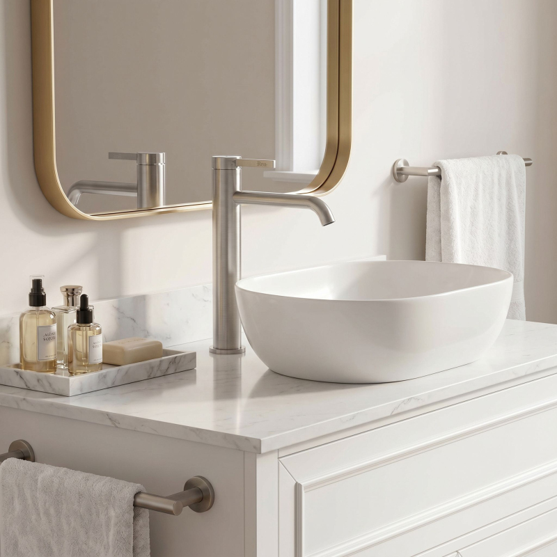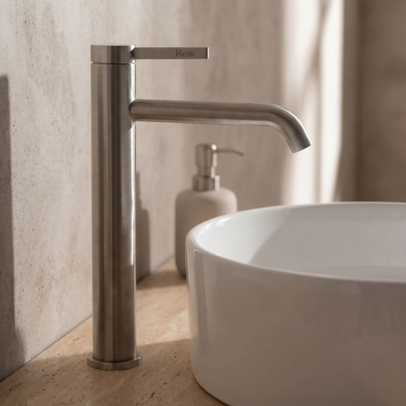 Dodejte umyvadlové zóně surový, a přitom elegantní a propracovaný akcent s vysokou umyvadlovou baterií Rea Rivo v povrchové úpravě Brushed Nickel. Tento štíhlý, vysoký model byl vytvořen pro moderní umyvadla na desku, kde záleží nejen na pohodlí při používání, ale také na uceleném a estetickém vzhledu celého aranžmá. Válcové tělo, jemně zaoblený výtok a minimalistická rukojeť dodávají baterii moderní charakter, který se skvěle hodí jak do surových, industriálních interiérů, tak do elegantnějších návrhů koupelen.Vysoká konstrukce – vyvýšené tělo zajišťuje pohodlné používání a dobře ladí s umyvadly na desku s vyšší mísou.Barva Brushed Nickel – jasně kovový povrch se silně zdůrazněnou, surovou strukturou kartáčování, zdůrazňuje moderní styl interiéru a pomáhá udržet estetický efekt každý den.Zaoblený výtok – jemně tvarovaná forma působí lehce a moderně a zároveň se dobře doplňuje s měkkými liniemi koupelnové keramiky.Perlátor – provzdušňuje proud vody, což zvyšuje komfort každodenného používání a podporuje hospodárnější spotřebu vody.Páková baterie – pohodlné ovládání jednou rukou umožňuje rychle a přesně nastavit teplotu a intenzitu proudu.Vysoká umyvadlová baterie Rea Rivo Brushed Nickel je návrh pro lidi, kteří hledají spojení moderní jednoduchosti se surovou, industriální povrchovou úpravou. Štíhlá silueta působí u umyvadla na desku efektně a Brushed Nickel vnáší do umyvadlové zóny kovový a ušlechtilý akcent s jasně viditelnou texturou. Je to model, který pomáhá vytvořit funkční, soudržný a stylový koupelnový prostor.