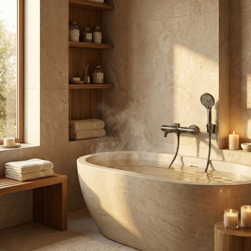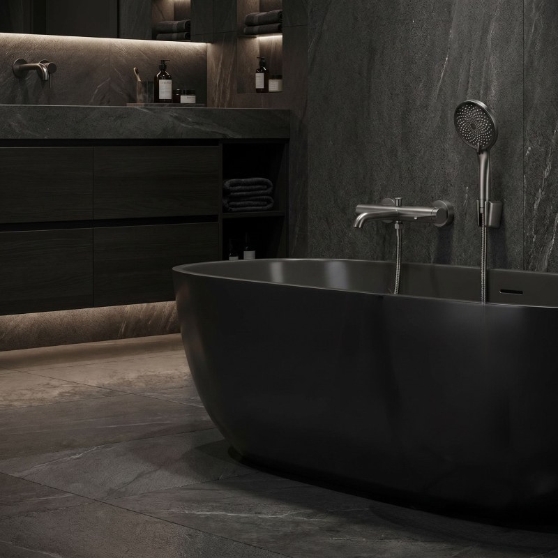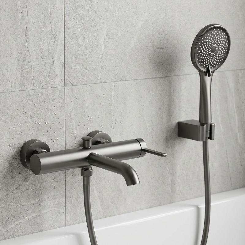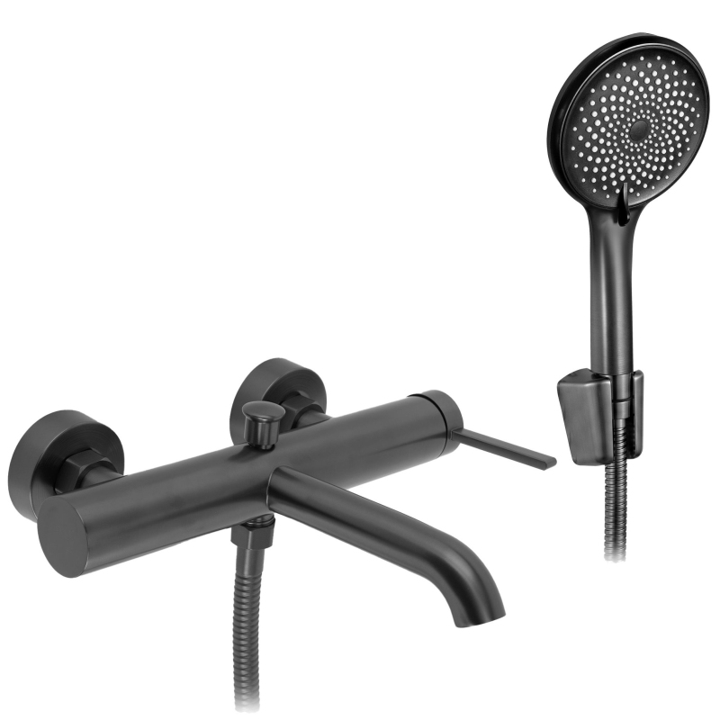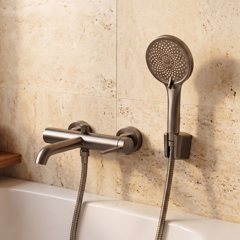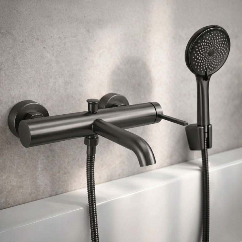 Vanová baterie Rivo v barvě titanu (Titanium) je výraznou nabídkou pro milovníky moderního designu a industriální elegance. Minimalistická, válcová forma těla v kombinaci s hlubokým, tmavým odstínem titanu vytváří sadu, která dodá vaší koupelně rozhodný charakter. Díky použití pokročilé technologie nanášení povlaku PVD armatura zaujme svou odolností a ušlechtilým saténovým povrchem.Povrchová úprava v barvě titanu – ušlechtilá tmavě šedá barva s matným leskem, která představuje vynikající a stylovou alternativu ke klasickému chromu nebo černé.Technologie PVD – špičková metoda nanášení barvy zajišťující extrémní odolnost proti poškrábání, korozi a změnám barvy.Sprchová sada v balení – baterie je vybavena ergonomickou sprchovou hlavicí se systémem Anti-Calc, hadicí a nástěnným držákem.Mechanický vanový přepínač – nenápadné tlačítko na těle baterie umožňuje pohodlné a rychlé přepínání proudu vody mezi výtokem a sprchovou hlavicí.Keramická kartuše – vysoce kvalitní vnitřní komponent zajišťuje plynulou a přesnou regulaci proudu a teploty vody.Minimalistická forma Rivo – geometrické tvary založené na kruhu dodávají baterii lehký a moderní vzhled.Solidní konstrukce – tělo vyrobené z odolné mosazi zajišťuje stabilitu nástěnné montáže a odolnost vůči vysokému tlaku vody.