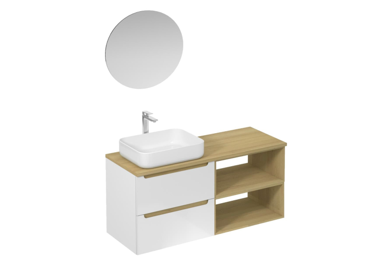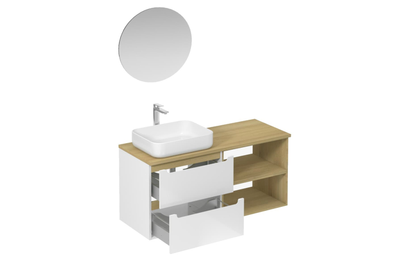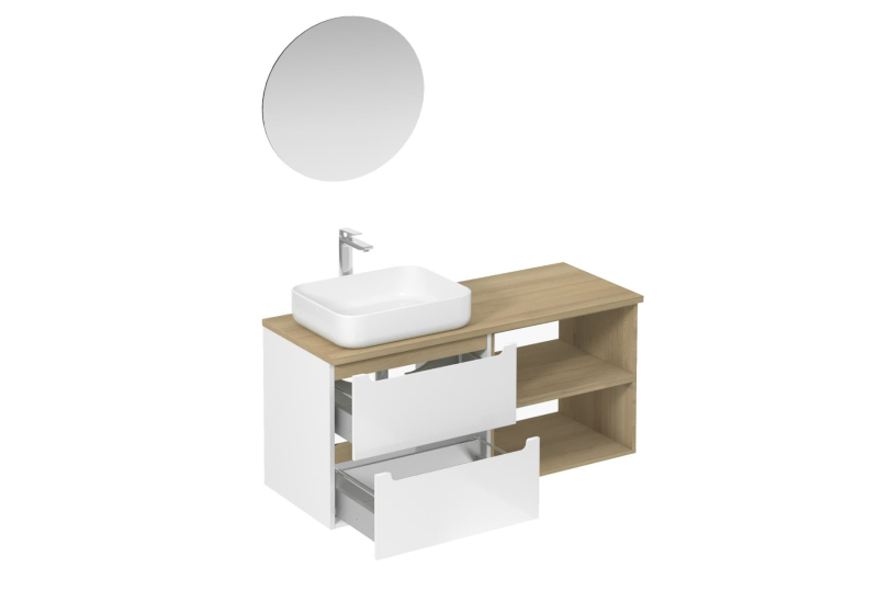 Závěsná koupelnová sestava s keramickým umyvadlem v bílé barvě s lesklým povrchem s fóliovaným povrchem. S plnovýsuvem a dotahem.