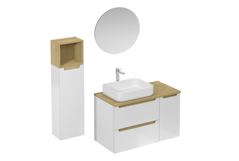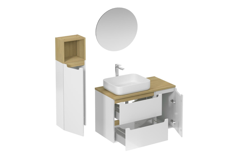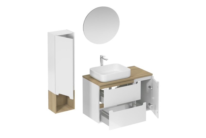 Závěsná koupelnová sestava s keramickým umyvadlem v bílé barvě s lesklým povrchem s fóliovaným povrchem. S plnovýsuvem a dotahem.