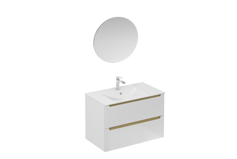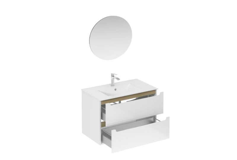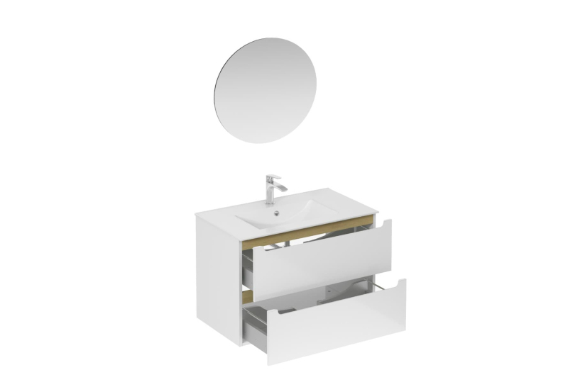 Závěsná koupelnová sestava s keramickým umyvadlem v bílé barvě s lesklým povrchem s fóliovaným povrchem. S plnovýsuvem a dotahem.