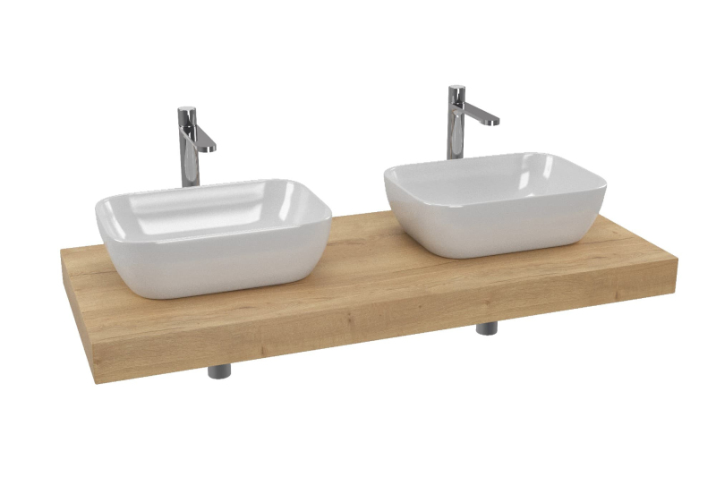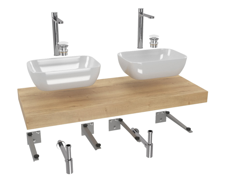 Cenově zvýhodněný koupelnový set se skládá ze třinácti výrobků - vodovodní baterie 2x, umyvadlo 2x, deska pod umyvadlo, zátka 2x, sifon 2x, konzole 4x