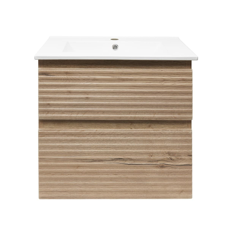 Závěsná koupelnová skříňka s keramickým umyvadlem v dekoru dub halifax s matným povrchem o rozměru 58x53x44,8 cm. Povrch v provedení lamino.