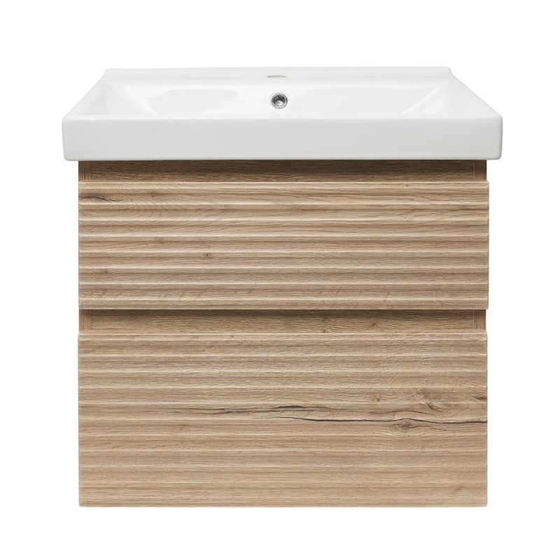 Závěsná koupelnová skříňka s keramickým umyvadlem v dekoru dub halifax s matným povrchem o rozměru 58x53x44,8 cm. Povrch v provedení lamino.