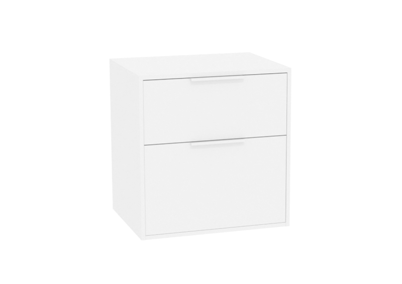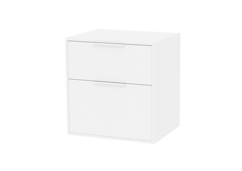 Závěsná koupelnová skříňka bez umyvadla v barevném provedení bílá matná s matným povrchem o rozměru 58,5x56,5x45,5 cm. Povrch v provedení lamino. S plnovýsuvem a dotahem.