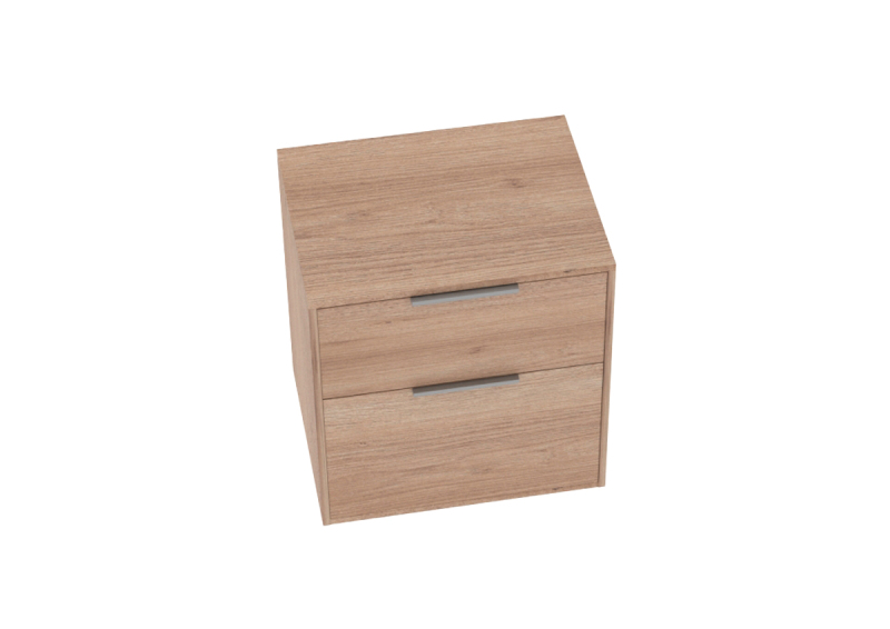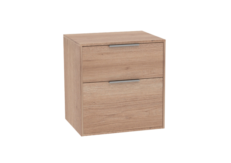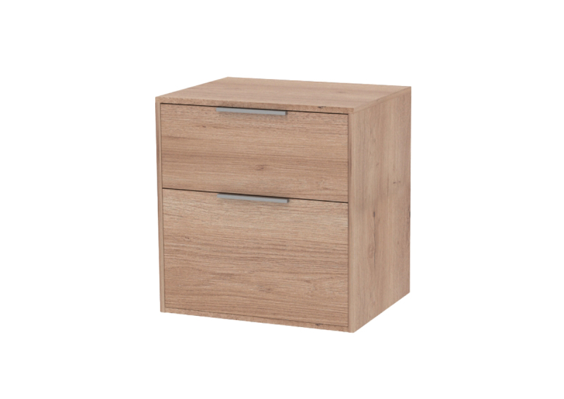 Závěsná koupelnová skříňka bez umyvadla v dekoru dub o rozměru 58,5x56,5x45,5 cm. Povrch v provedení lamino. S plnovýsuvem a dotahem.