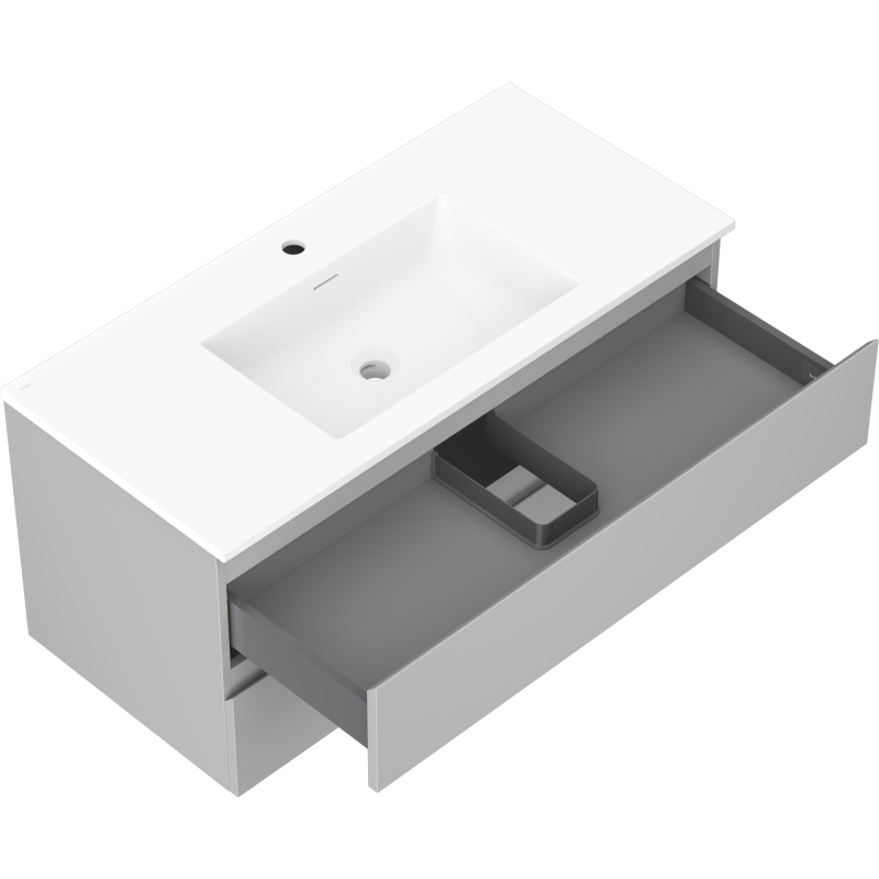 Specifikace produktu: Rozměry skříňky: Šířka: 100 cm Hloubka: 46 cm Výška: 47 cm Barva korpusu: Matně šedá Materiál korpusu: Lakovaná deska Barva čela: Matně šedá Materiál čela: Lakovaná MDF deska Struktura čela: Hladká Počet zásuvek: 2 Prostorná zásuvka s funkcí tlumeného dovírání Povrch odolný vůči UV záření Rozměry umyvadla: Šířka: 101 cm Hloubka: 46,5 cm Výška: 16,5 cm Barva umyvadla: Matně bílá Materiál umyvadla: Konglomerát Otvor pro přepad: Ano Otvor pro baterii: Ano Smontovaný výrobek