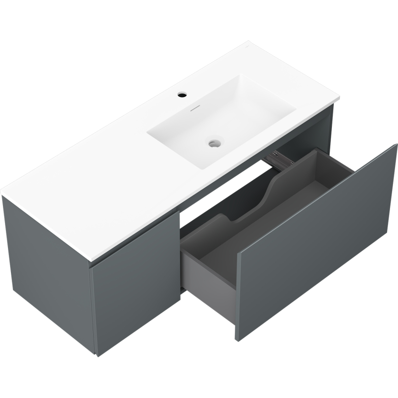 Specifikace produktu: Rozměry skříňky: Šířka: 120 cm Hloubka: 46 cm Výška: 47 cm Sada obsahuje: Zásuvková skříňka pod umyvadlo: Šířka: 80 cm Hloubka: 46 cm Výška: 47 cm Barva korpusu: Matný grafit Materiál korpusu: Lakovaná deska Barva čela: Matný grafit Materiál čela: Lakovaná MDF deska Struktura čela: Hladká Počet zásuvek: 1 Prostorná zásuvka s funkcí tlumeného dovírání Umyvadlová skříňka s dvířky: Šířka: 40 cm Výška: 47 cm Hloubka: 46 cm Barva korpusu: Matný grafit Materiál korpusu: Lakovaná deska Barva čela: Matný grafit Materiál čela: Lakovaná MDF deska Struktura čela: Hladká Počet dvířek: 1 1 police Panty s funkcí tlumeného dovírání Univerzální montáž dvířek (levé/pravé) Povrch odolný vůči UV záření Umyvadlo: Šířka: 121 cm Hloubka: 46,5 cm Výška: 16,5 cm Barva umyvadla: Matná bílá Materiál umyvadla: Konglomerát Otvor pro přepad: Ano Otvor pro baterii: Ano Smontovaný výrobek