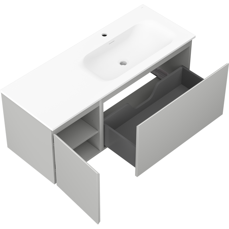 Specifikace produktu: Rozměry skříňky: Šířka: 120 cm Hloubka: 46 cm Výška: 47 cm Sada obsahuje: Zásuvková skříňka pod umyvadlo: Šířka: 80 cm Hloubka: 46 cm Výška: 47 cm Barva korpusu: Matně šedá Materiál korpusu: Lakovaná deska Barva čela: Matně šedá Materiál čela: Lakovaná MDF deska Struktura čela: Hladká Počet zásuvek: 1 Prostorná zásuvka s funkcí tlumeného dovírání Umyvadlová skříňka s dvířky: Šířka: 40 cm Výška: 47 cm Hloubka: 46 cm Barva korpusu: Matně šedá Materiál korpusu: Lakovaná deska Barva čela: Matně šedá Materiál čela: Lakovaná MDF deska Struktura čela: Hladká Počet dvířek: 1 1 police Panty s funkcí tlumeného dovírání Univerzální montáž dvířek (levé/pravé) UV odolný povrch Umyvadlo: Šířka: 121 cm Hloubka: 46,5 cm Výška: 16,5 cm Barva umyvadla: Matně bílá Materiál umyvadla: Konglomerát Otvor pro přepad: Ano Otvor pro baterii: Ano Smontovaný výrobek