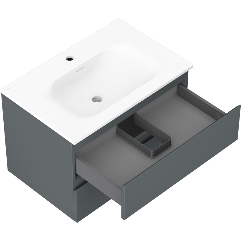 Specifikace produktu: Rozměry skříňky: Šířka: 70 cm Hloubka: 46 cm Výška: 47 cm Barva korpusu: Matný grafit Materiál korpusu: Lakovaná deska Barva čela: Matný grafit Materiál čela: Lakovaná MDF deska Struktura čela: Hladká Počet zásuvek: 2 Prostorná zásuvka s funkcí tlumeného dovírání Povrch odolný vůči UV záření Rozměry umyvadla: Šířka: 71 cm Hloubka: 46,5 cm Výška: 16,5 cm Barva umyvadla: Matná bílá Materiál umyvadla: Konglomerát Otvor pro přepad: Ano Otvor pro baterii: Ano Smontovaný výrobek