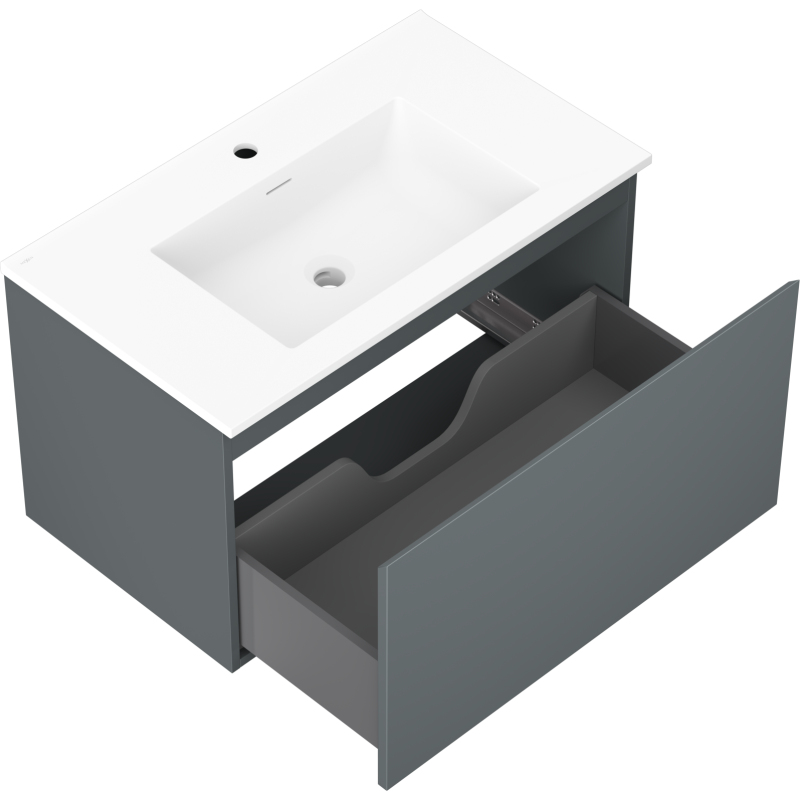 Specifikace produktu: Rozměry skříňky: Šířka: 80 cm Hloubka: 46 cm Výška: 47 cm Barva korpusu: Matný grafit Materiál korpusu: Lakovaná deska Barva čela: Matný grafit Materiál čela: Lakovaná MDF deska Struktura čela: Hladká Počet zásuvek: 1 Prostorná zásuvka s funkcí tlumeného dovírání Povrch odolný vůči UV záření Rozměry umyvadla: Šířka: 81 cm Hloubka: 46,5 cm Výška: 16,5 cm Barva umyvadla: Matná bílá Materiál umyvadla: Konglomerát Otvor pro přepad: Ano Otvor pro baterii: Ano Smontovaný výrobek