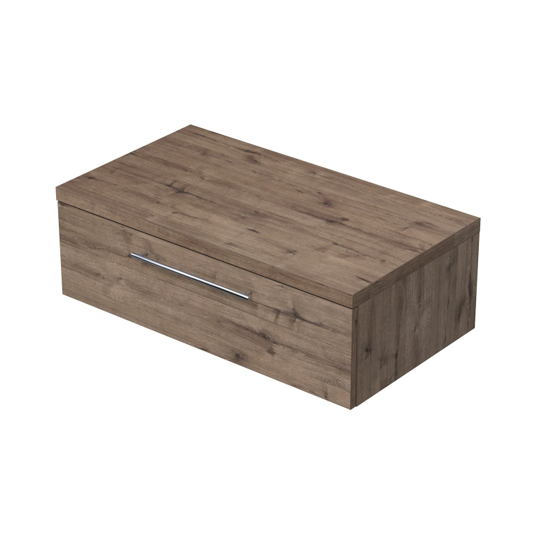 Závěsná koupelnová skříňka pod umyvadlo v provedení dub wellington o rozměru 90x29,6x50 cm. Povrch v provedení lamino. S plnovýsuvem a dotahem.