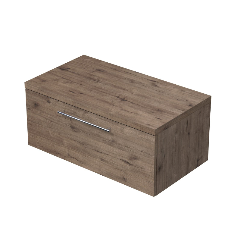 Závěsná koupelnová skříňka pod umyvadlo v provedení dub wellington o rozměru 90x39,6x50 cm. Povrch v provedení lamino. S plnovýsuvem a dotahem.
