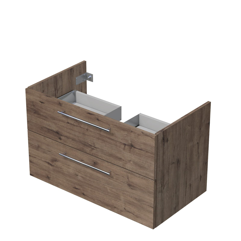 Závěsná koupelnová skříňka pod umyvadlo v provedení dub wellington o rozměru 90x59,6x50 cm. Povrch v provedení lamino. S plnovýsuvem a dotahem.