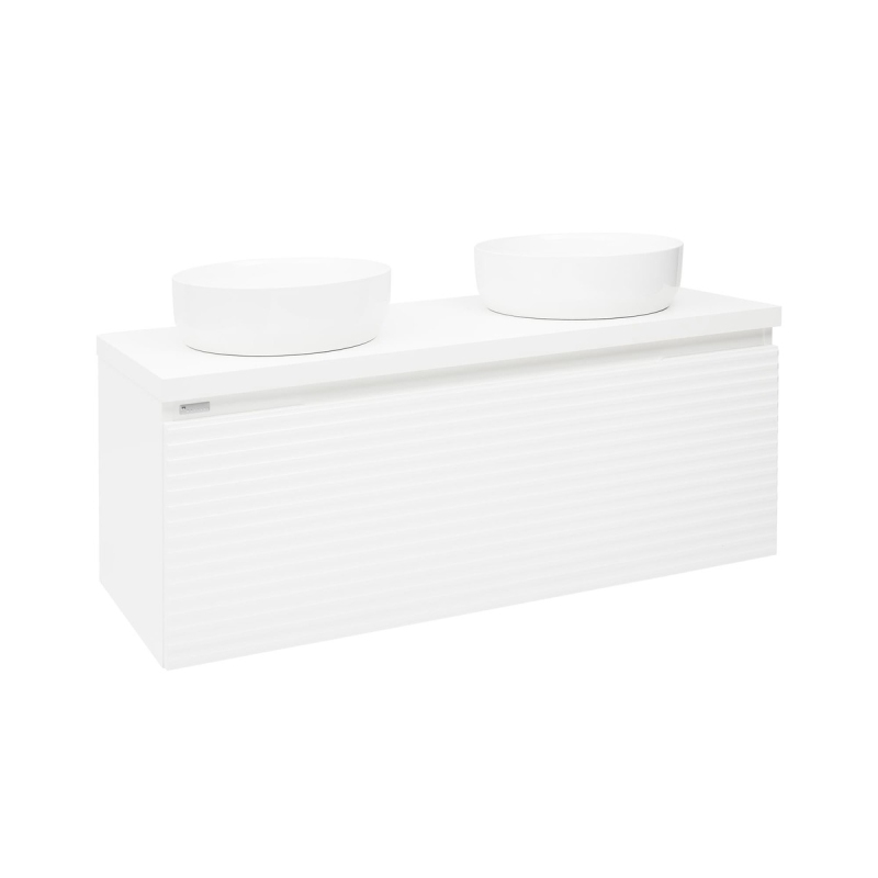 Závěsná koupelnová skříňka pod umyvadlo v bílé lesklé barvě. S lesklým povrchem o rozměru 118x43x44,8 cm. Povrch v provedení lamino.