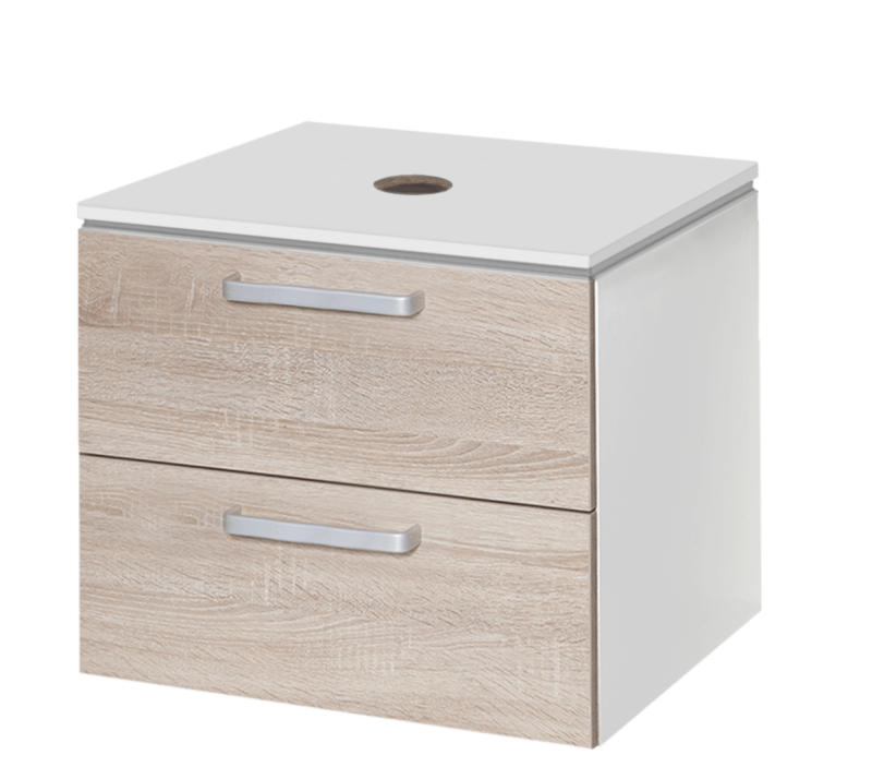 Skříňka pod umyvadlovou mísu - bílý korpus, čela zásuvek dub bardolino, horní deska bílá. Zásuvka mají plnovýsuv s dotahem, dodáváno v rozloženém stavu. Kompatibilní s umyvadly na desku, které rozměrově odpovídají technickému výkresu desky. Skříňka je určena pro umyvadla do hmotnosti 15 kg.