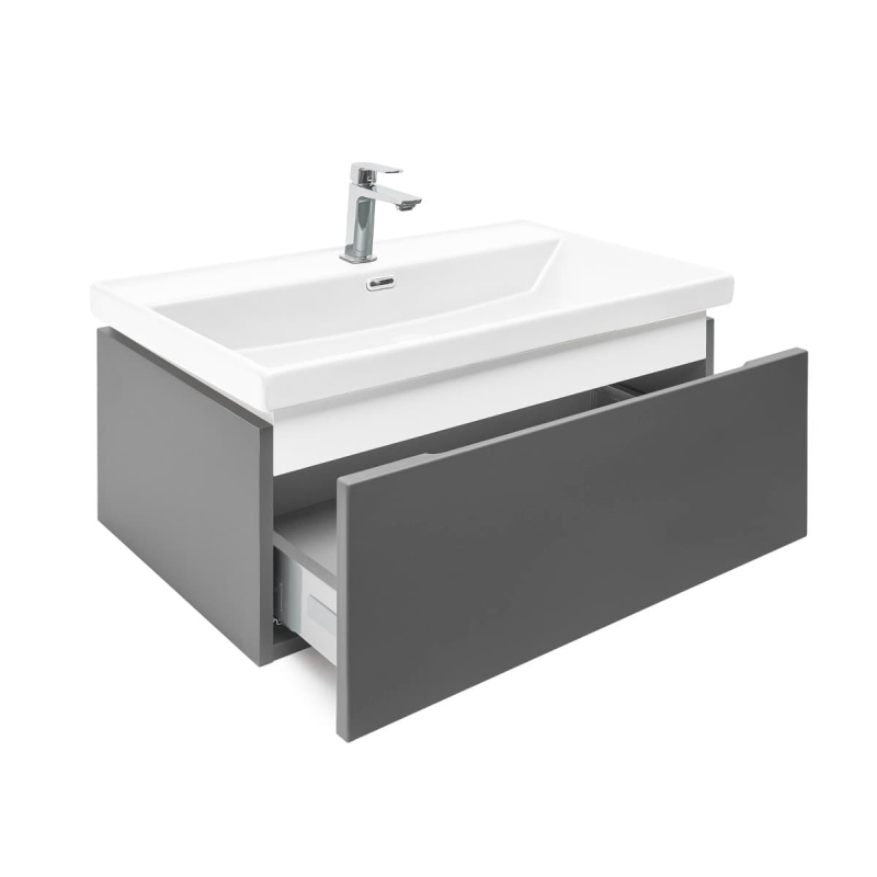 Závěsná koupelnová skříňka s keramickým umyvadlem v antracitové barvě s matným povrchem o rozměru 80x30x44,8 cm. Povrch v provedení lamino.