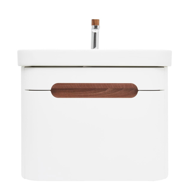 Závěsná koupelnová skříňka s keramickým umyvadlem v bílém matném provedení s matným povrchem o rozměru 57,5x43x45 cm. Povrch v provedení lamino.
