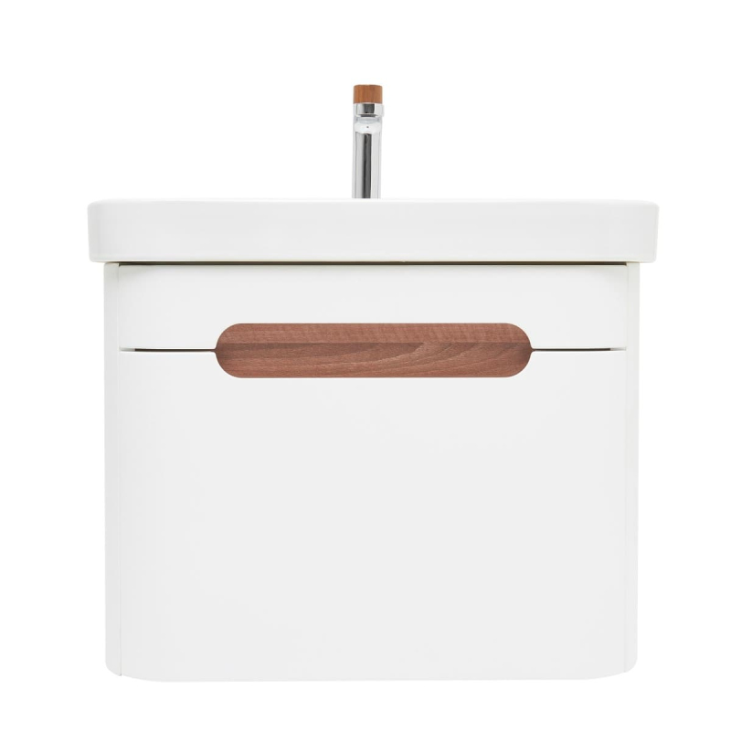 Závěsná koupelnová skříňka s keramickým umyvadlem v bílém matném provedení s matným povrchem o rozměru 57,5x43x45 cm. Povrch v provedení lamino.
