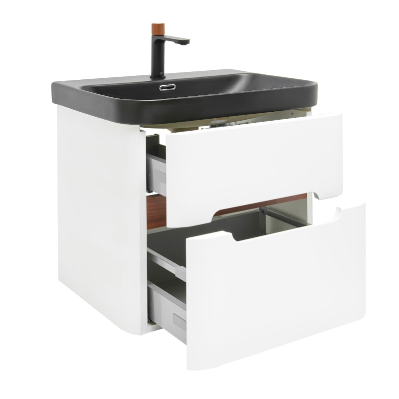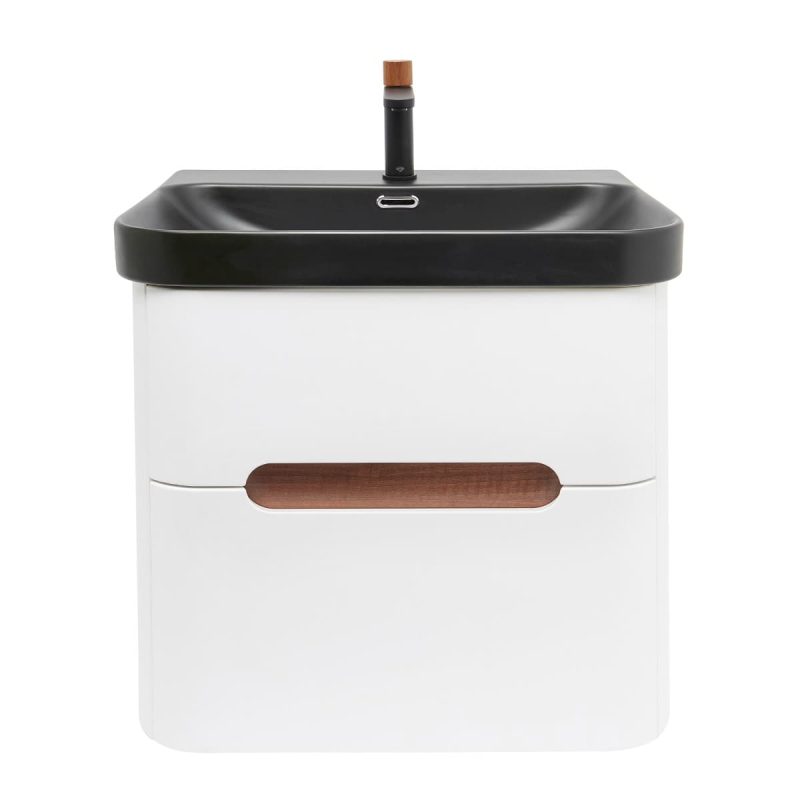 Závěsná koupelnová skříňka s keramickým umyvadlem v bílém matném provedení s matným povrchem o rozměru 57,5x53x45 cm. Povrch v provedení lamino.
