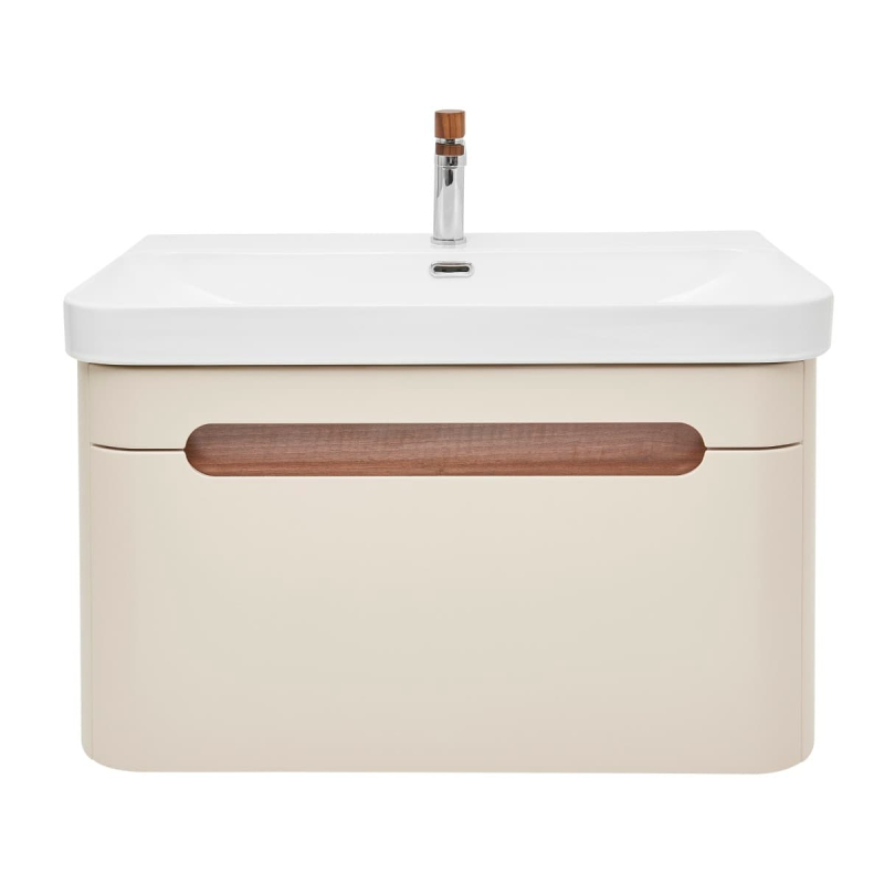Závěsná koupelnová skříňka s keramickým umyvadlem v provedení pískově béžová s matným povrchem o rozměru 77,5x43x45 cm. Povrch v provedení lamino.