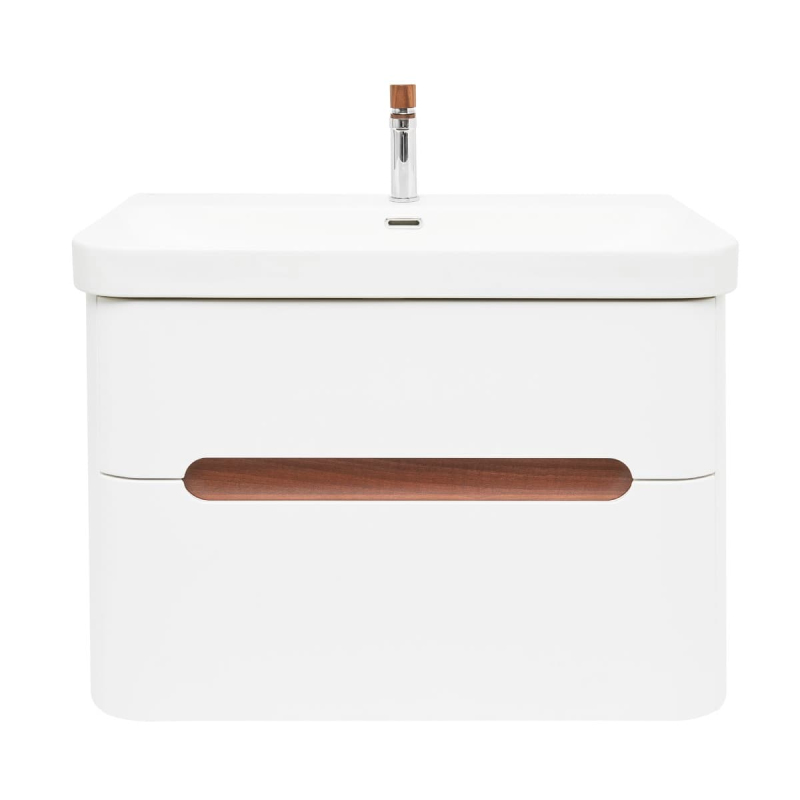 Závěsná koupelnová skříňka s keramickým umyvadlem v bílém matném provedení s matným povrchem o rozměru 77,5x53x45 cm. Povrch v provedení lamino.