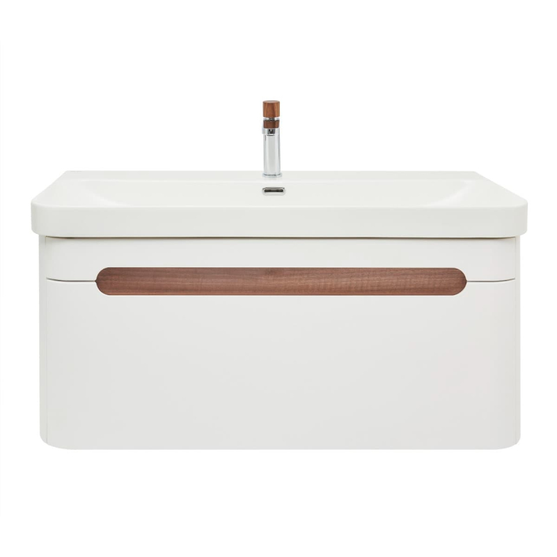 Závěsná koupelnová skříňka s keramickým umyvadlem v bílém matném provedení s matným povrchem o rozměru 97,5x43x45 cm. Povrch v provedení lamino.