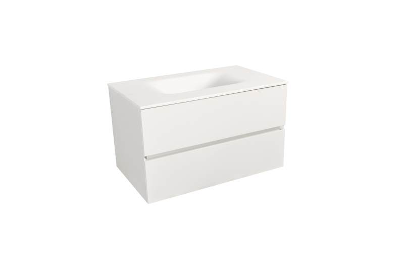Skříňka v bílém matném nástřiku s umyvadlem v bílém matu z litého mramoru o šířce 66 cm. Dvě zásuvky v provedení bez úchytky.