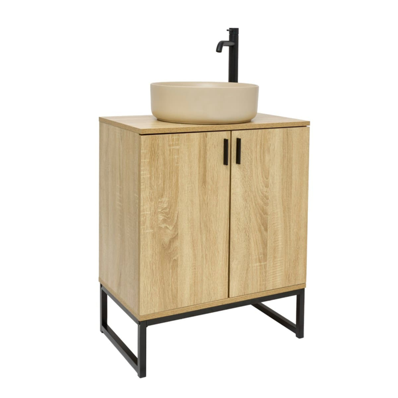 Stojící koupelnová skříňka s keramickým umyvadlem v provedení světlý dub s lesklým povrchem o rozměru 60x73x36 cm. S povrchem z MDF desky. Dvířka mají levé i pravé otevírání.