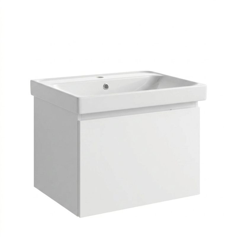 Závěsná koupelnová skříňka s keramickým umyvadlem v bílé barvě s lesklým povrchem o rozměru 60x45x46 cm. Povrch v provedení fólie.