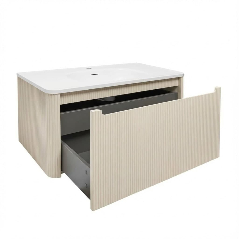Závěsná koupelnová skříňka s umyvadlem z litého mramoru v barevném provedení light pine s matným povrchem o rozměru 99x47,5x45 cm. Povrch v provedení fólie. S plnovýsuvem a dotahem.