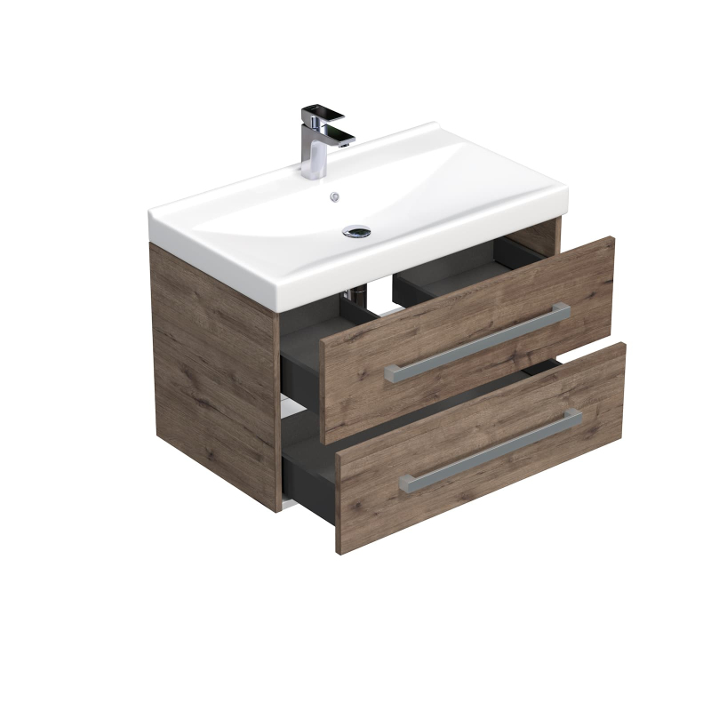Závěsná koupelnová skříňka s keramickým umyvadlem v provedení dub wellington s matným povrchem o rozměru 80x53x46 cm. Povrch v provedení lamino.
