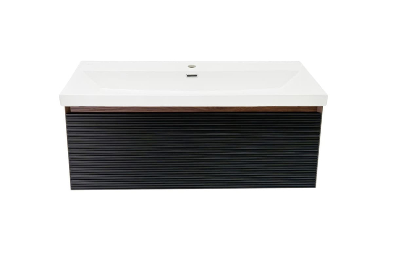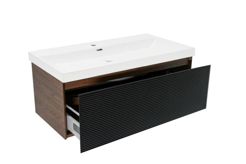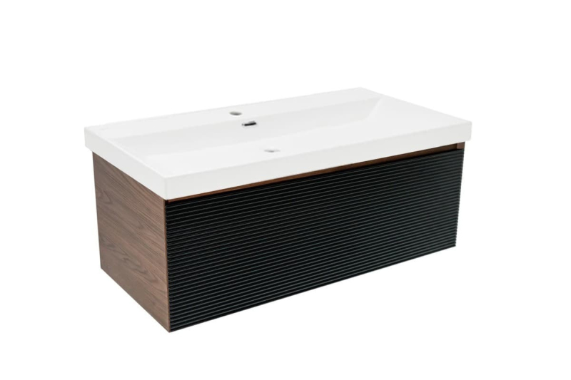 Závěsná koupelnová skříňka s keramickým umyvadlem v dekoru ořech s matným povrchem o rozměru 99x30x45 cm. Povrch v provedení lamino.