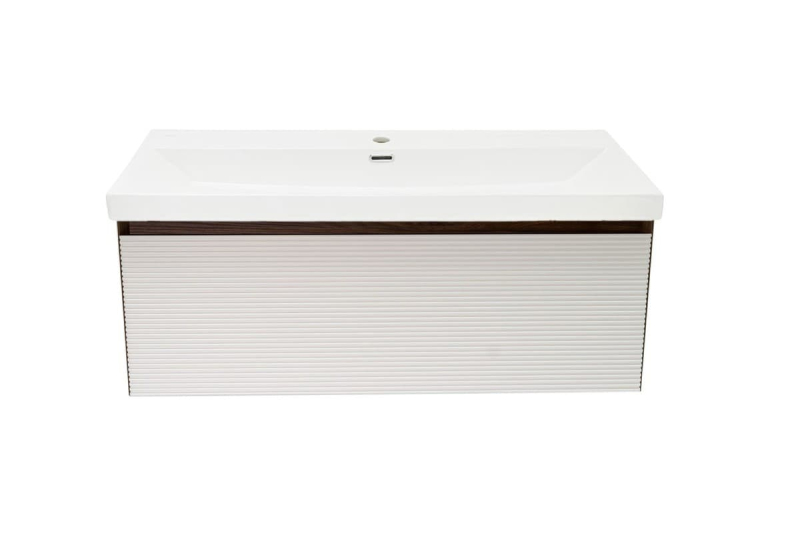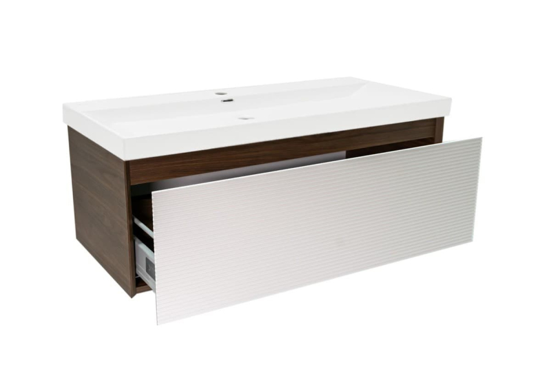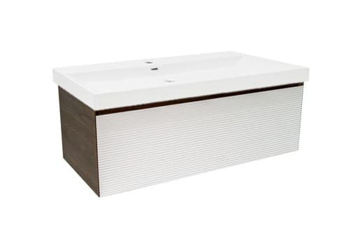 Závěsná koupelnová skříňka s keramickým umyvadlem v dekoru ořech s matným povrchem o rozměru 99x30x45 cm. Povrch v provedení lamino.