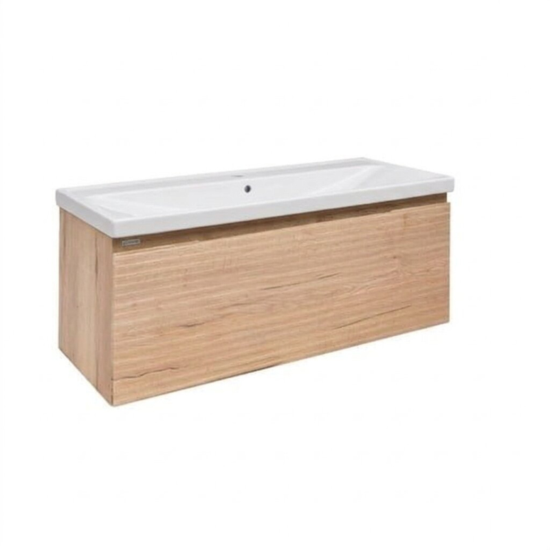 Závěsná koupelnová skříňka s keramickým umyvadlem v dekoru dub halifax s matným povrchem o rozměru 118x43x44,8 cm. Povrch v provedení fólie.