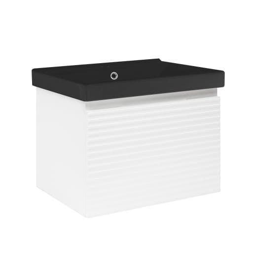 Závěsná koupelnová skříňka s keramickým umyvadlem v bílé barvě s lesklým povrchem o rozměru 58x43x45 cm. Povrch v provedení fólie.