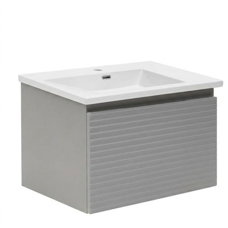 Závěsná koupelnová skříňka s keramickým umyvadlem v šedé barvě s matným povrchem o rozměru 78x43x44,8 cm. Povrch v provedení fólie.