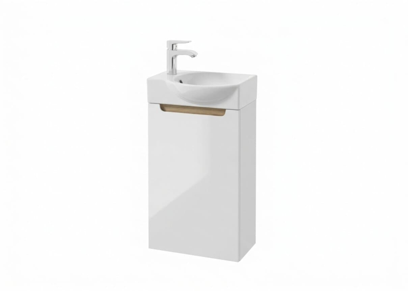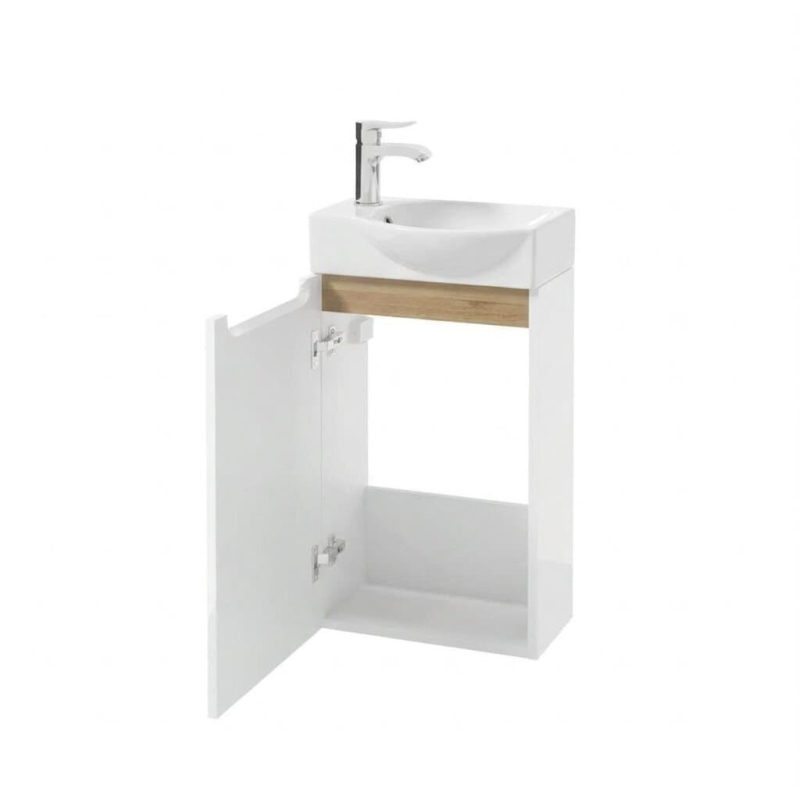 Závěsná koupelnová skříňka s keramickým umyvadlem v bílé barvě s lesklým povrchem o rozměru 39x60x22 cm. Dvířka mají levé i pravé otevírání.