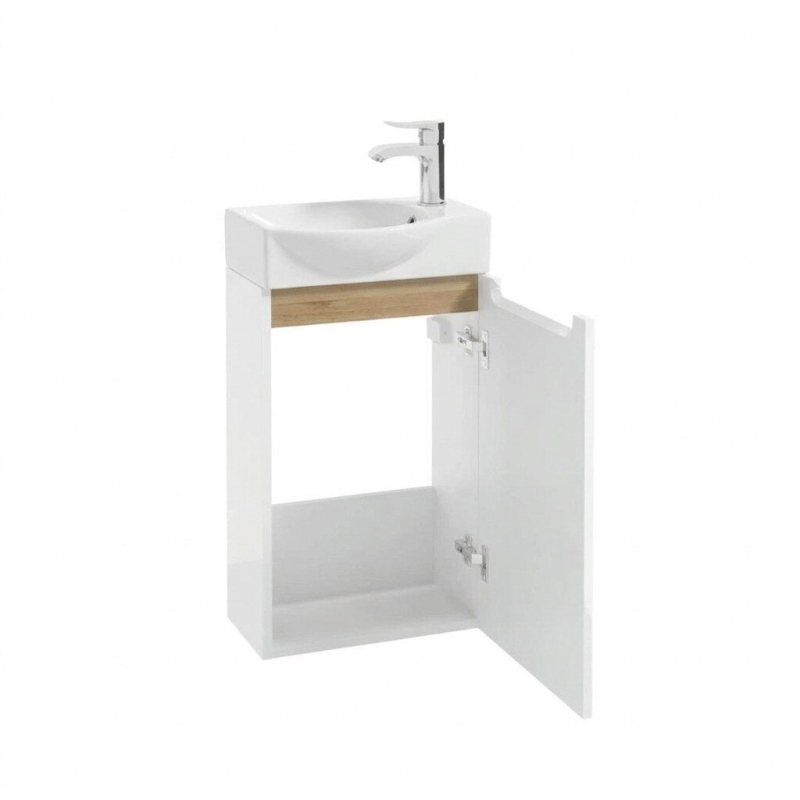 Závěsná koupelnová skříňka s keramickým umyvadlem v bílé barvě s lesklým povrchem o rozměru 39x60x22 cm. Dvířka mají levé i pravé otevírání.
