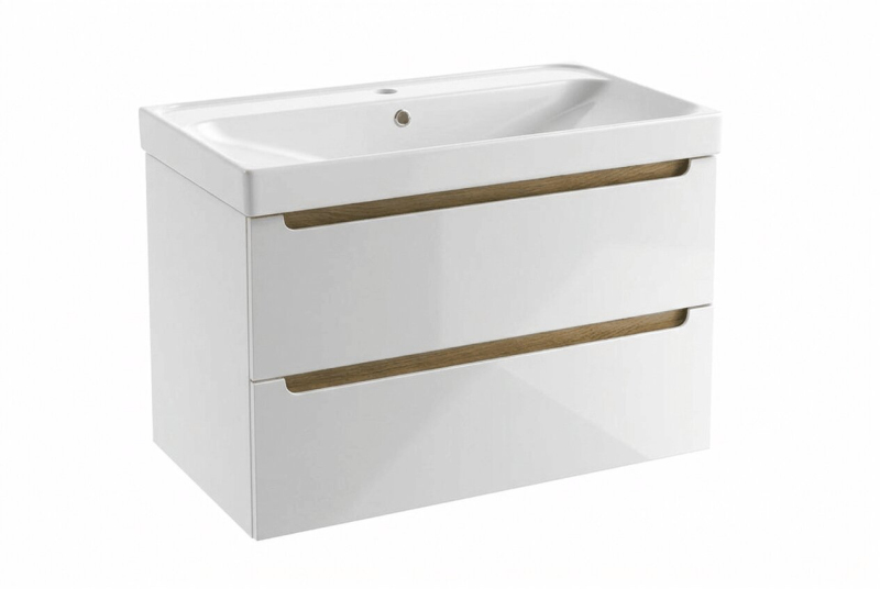 Závěsná koupelnová skříňka s keramickým umyvadlem v bílé barvě s lesklým povrchem o rozměru 80x60x45 cm. s povrchem z MDF desky