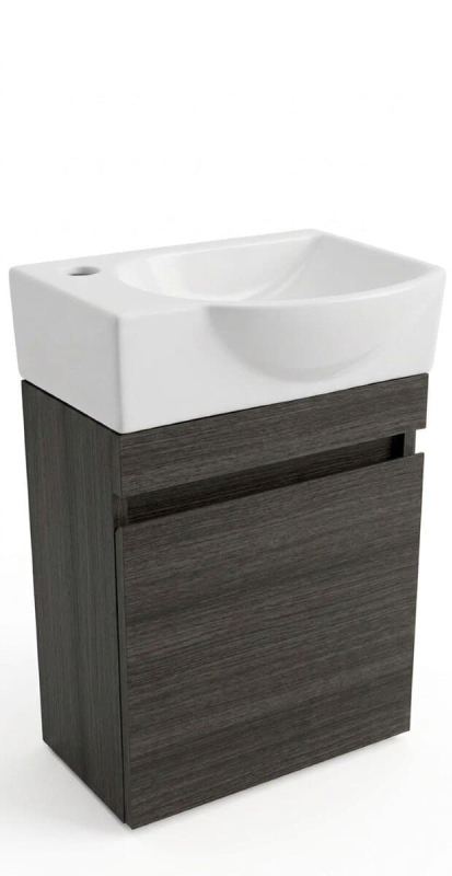 Závěsná koupelnová skříňka s keramickým umyvadlem v barevném provedení tmavé dřevo s matným povrchem o rozměru 40x53,2x22 cm. Dvířka mají levé i pravé otevírání.