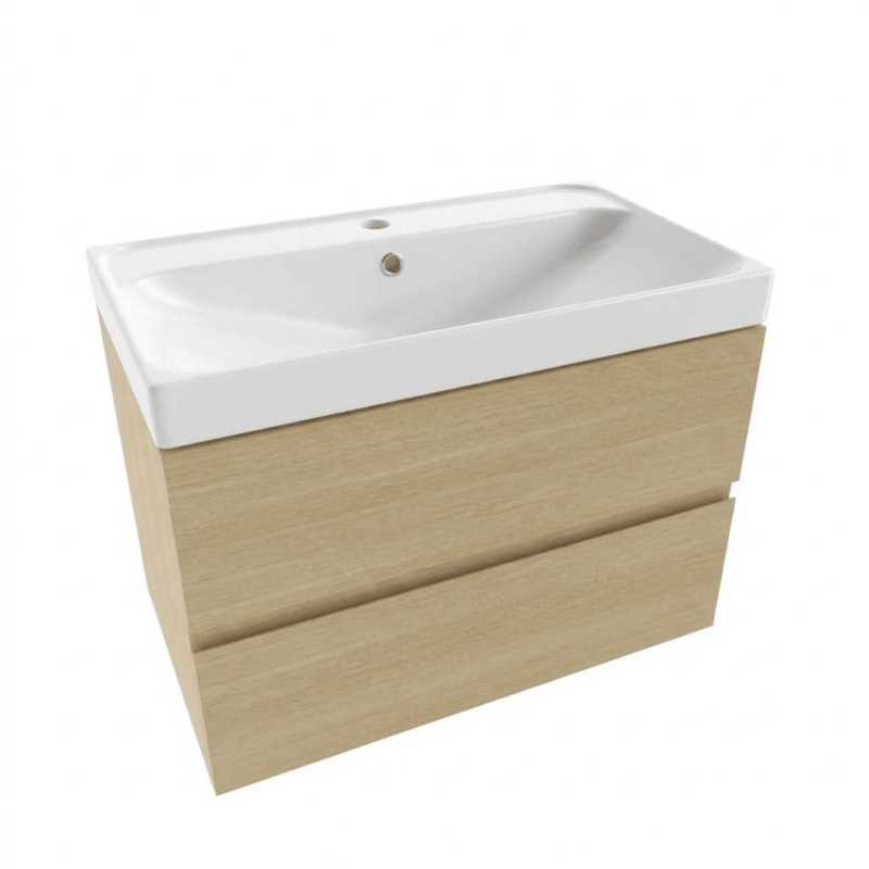 Závěsná koupelnová skříňka s keramickým umyvadlem v dekoru světlé dřevo s matným povrchem o rozměru 80x50x45,5 cm. Povrch v provedení lamino.