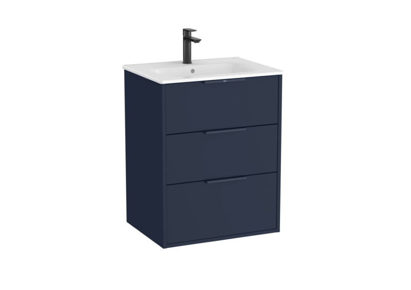 Závěsná koupelnová skříňka s keramickým umyvadlem v barevném provedení modrá s matným povrchem o rozměru 60x75,7x45,5 cm. Povrch v provedení lamino. S plnovýsuvem a dotahem.