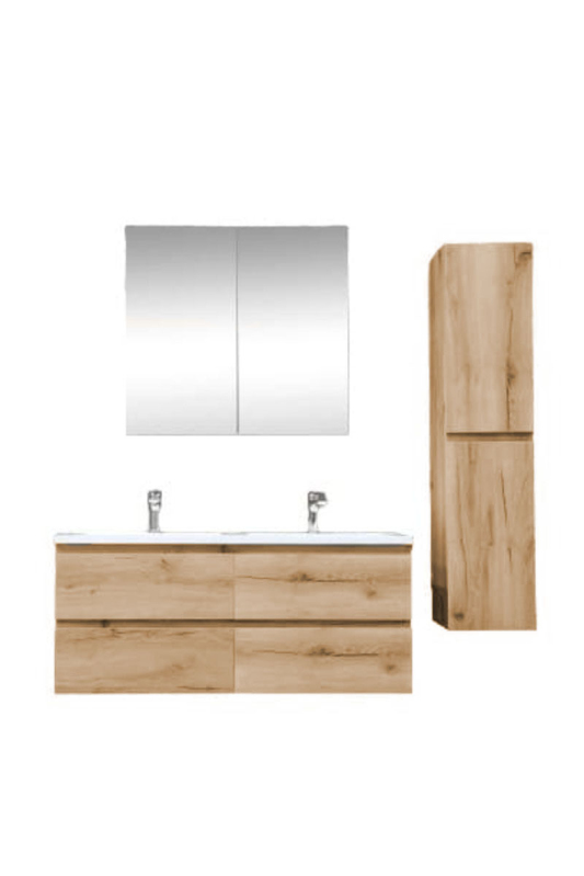 Závěsná koupelnová skříňka s umyvadlem z litého mramoru v dekoru dub s matným povrchem o rozměru 119x50x45 cm. Povrch v provedení lamino. Včetně zrcadla.