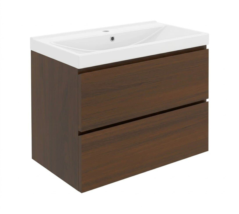 Závěsná koupelnová skříňka s keramickým umyvadlem v dekoru ořech s matným povrchem o rozměru 59x50x45 cm. Povrch v provedení lamino.
