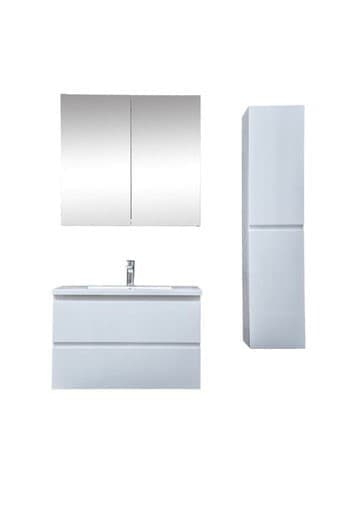 Závěsná koupelnová skříňka s umyvadlem z litého mramoru v bílé barvě v lesklém provedení o rozměru 79x50x45 cm. Povrch v provedení lamino. Včetně zrcadla.