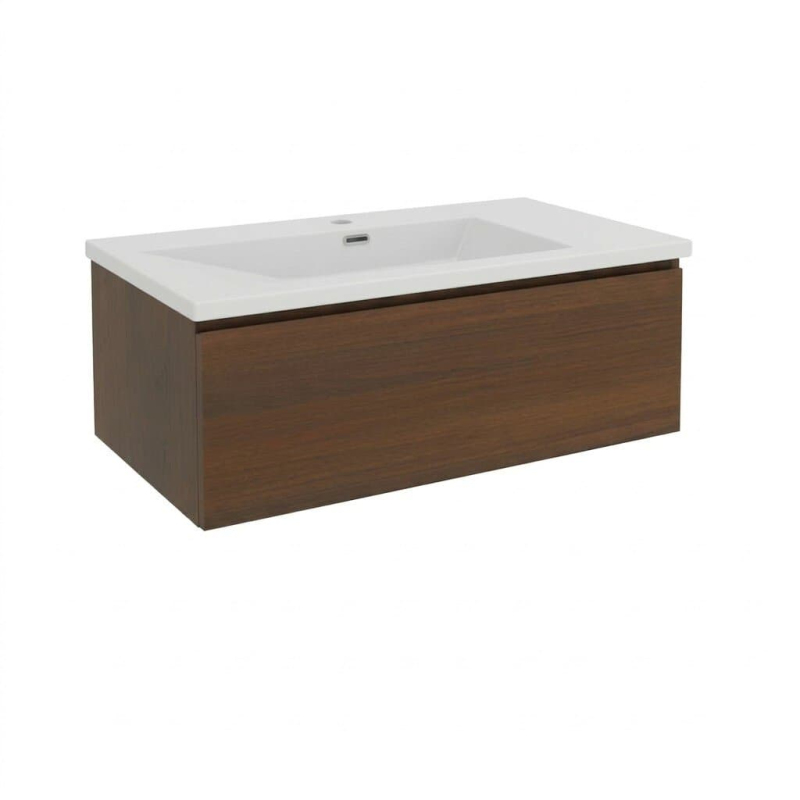 Závěsná koupelnová skříňka s keramickým umyvadlem v dekoru ořech s matným povrchem o rozměru 80x30x45 cm. Povrch v provedení lamino.