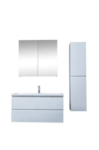 Závěsná koupelnová skříňka s umyvadlem z litého mramoru v bílé barvě v lesklém provedení o rozměru 99x50x45 cm. Povrch v provedení lamino. Včetně zrcadla.