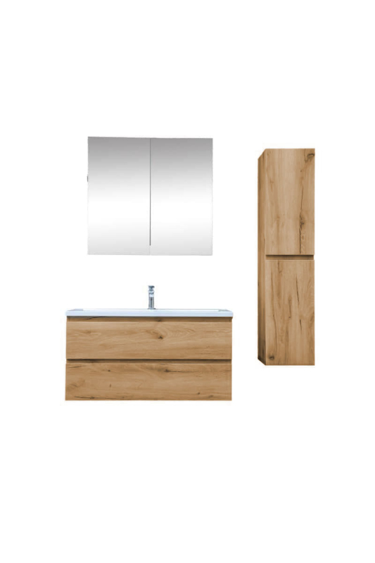 Závěsná koupelnová skříňka s umyvadlem z litého mramoru v dekoru dub s matným povrchem o rozměru 99x50x45 cm. Povrch v provedení lamino. Včetně zrcadla.