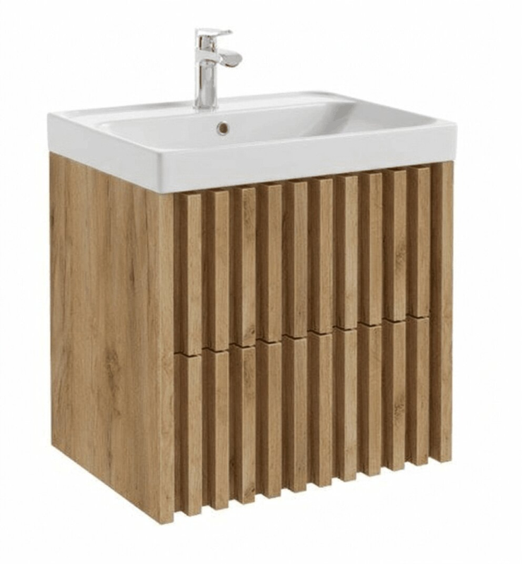 Závěsná koupelnová skříňka s keramickým umyvadlem v dekoru dub s matným povrchem o rozměru 60x55x45 cm. Povrch v provedení lamino.